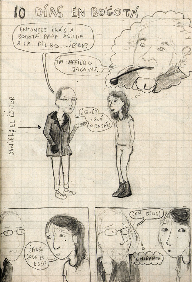 La semana pasada estuve en Bogotá en la Feria del Libro y también haciendo otras cositas con la novela gráfica que salió el diciembre pasado. La propuesta era hacer un diario, rápido, sin pretensiones y en estilo random sobre la estadía en esa ciudad. Acá la primera página, mañana subo el resto.